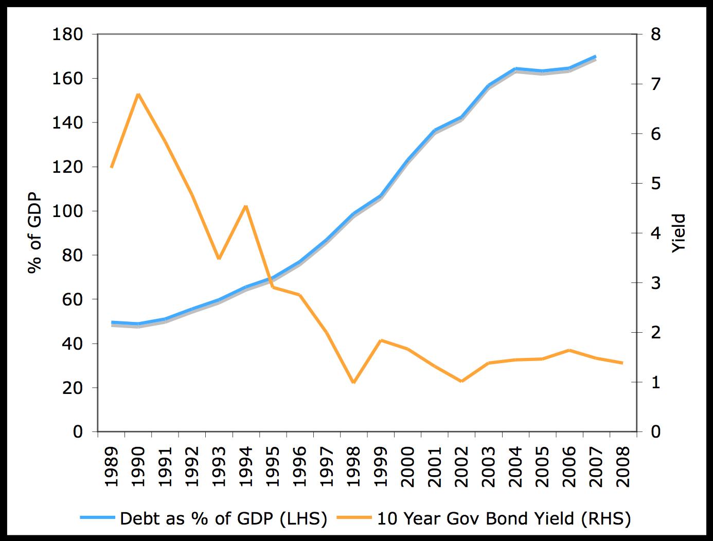 Sin embargo el aspecto mas interesante de esta situación, es que a pesar del masivo incremento del endeudamiento y en contra-vía de lo que predice la teoría económica neoclásica, las tasas de interés sobre los bonos de deuda del gobierno japonés no solo no crecieron, sino que de hecho cayeron por debajo de los niveles previos a la crisis.
