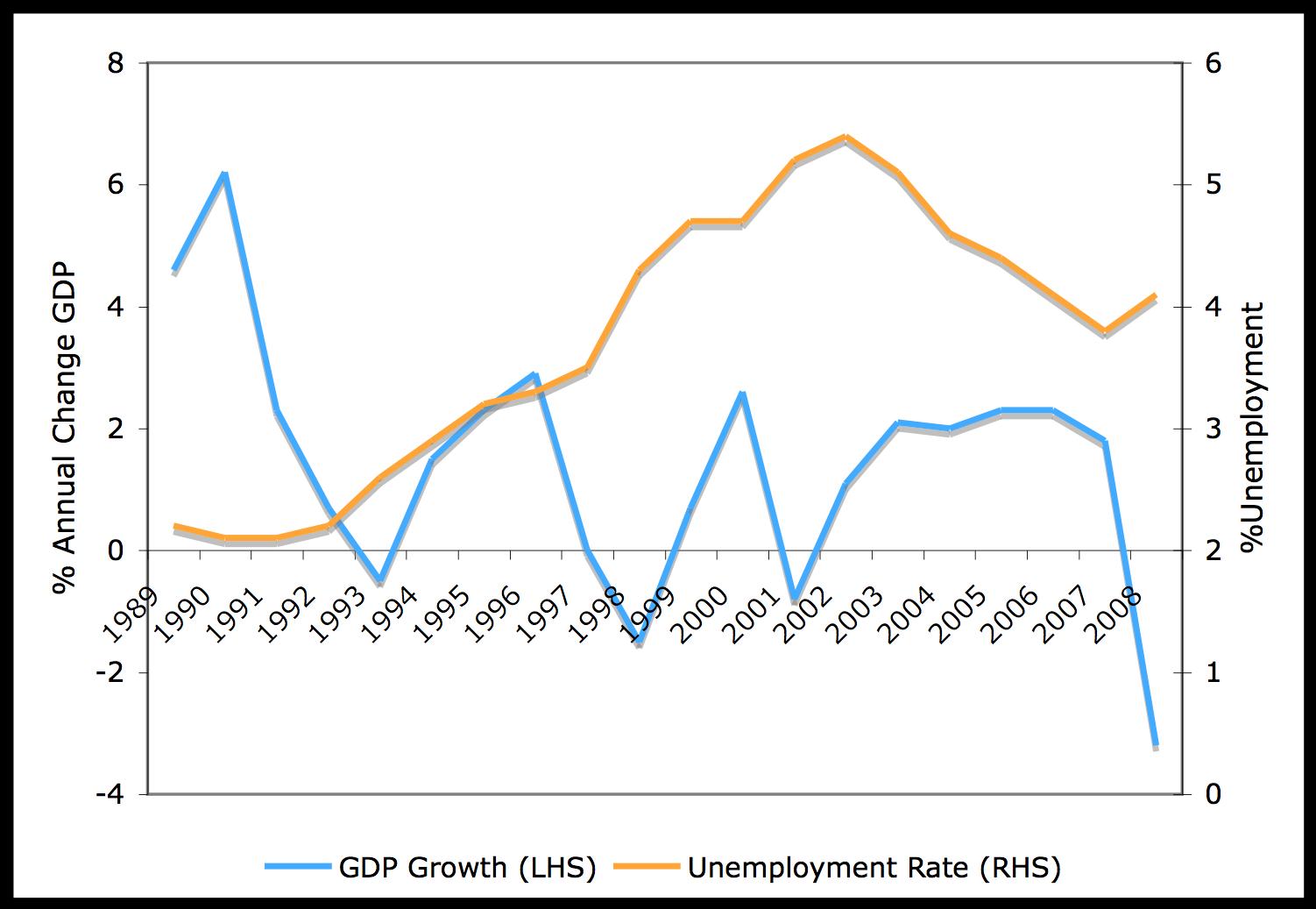 | Grafico 2 – Evolución de PIB y Desempleo Japón (1989 – 2008)