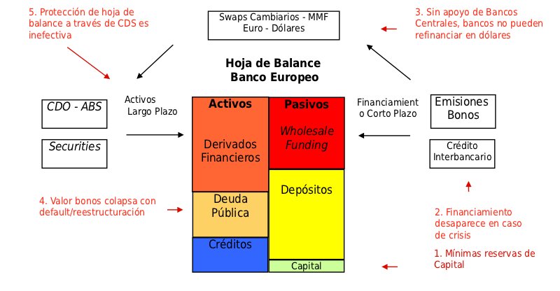En el gráfico 16 se muestra la imagen de como estos diferentes problemas afectan la hoja de balance de los bancos europeos. A medida que el financiamiento de corto plazo, los bancos se ven presionado a liquidar sus posiciones. Al vender activos, terminan reconociendo perdidas y al reducir los precios en los mercados extienden los problemas a otros bancos. Esta dinámica crea una espiral que termina con la insolvencia de los bancos.