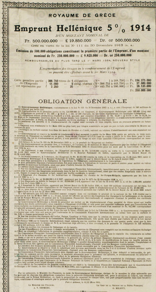 [22] Según Driault y Lhéritier, que se basan en otros trabajos serios, los títulos griegos emitidos en Francia eran comprados, casi exclusivamente, por griegos residentes en Francia y no por franceses. Véase Édouard Driault y Michel Lhéritier, Histoire diplomatique de la Grèce de 1821 à nos jours, Presses universitaires de France (PUF), 1926, tome IV, p. 304, note 1.