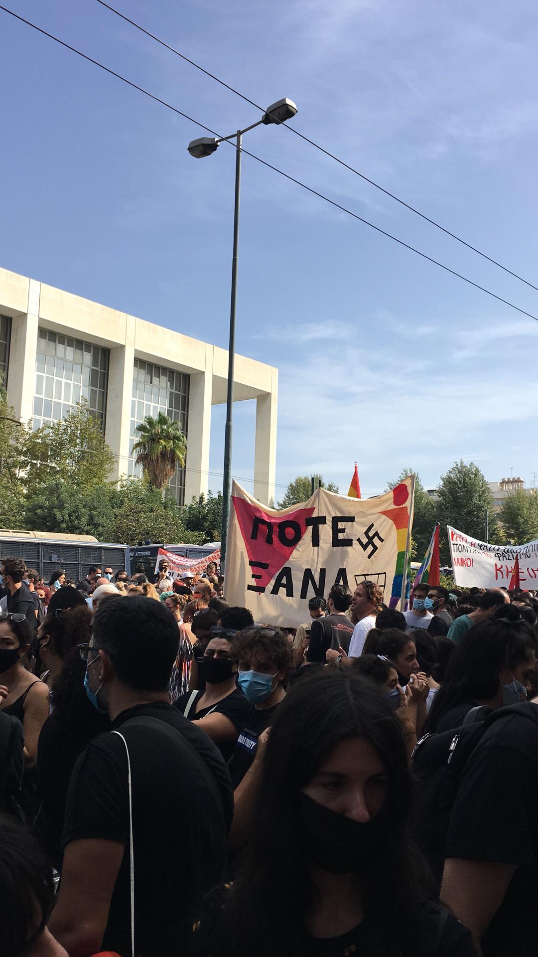 «Um ajuntamento antifascista enorme, na Alameda Alexandras diante do tribunal de Atenas. Nesta quarta-feira, 7 de outubro, milhares (cerca de 20.000 segundo algumas fontes) de militantes de esquerda, de extrema esquerda e anarquistas vieram aguardar o veredicto do processo contra a Aurora Dourada, o partido neonazi que passou a ter assento no Parlamento em 2012, à boleia da crise grega. O partido estava envolvido no assassínio do rapper antifascista Pavlos Fyssas, em 2013, de que era acusado um dos membros do partido. Mas a acusação envolvia também as tentativas de assassínio perpetradas contra dois pescadores egípcios. Ou seja, três dos mais conhecidos crimes e violências da Aurora Dourada.