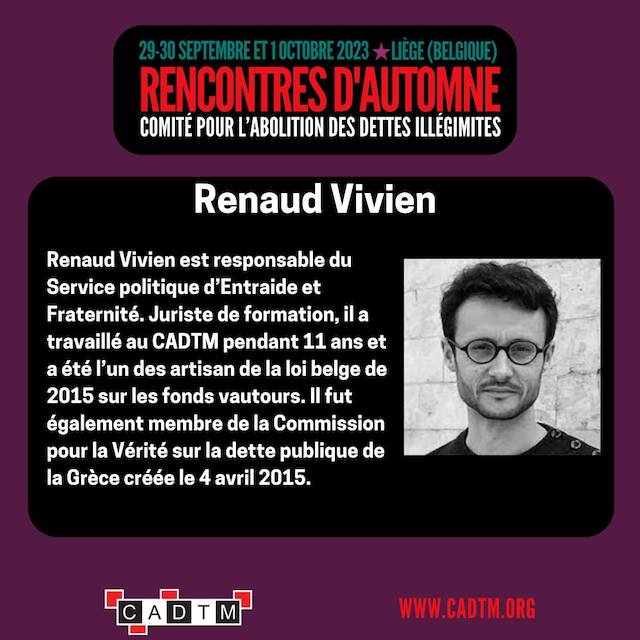 Renaud Vivien est responsable du Service politique d’Entraide et Fraternité. Il a travaillé au CADTM pendant 11 ans et a été l’une des artisanes de la loi belge de 2015 sur les fonds vautours