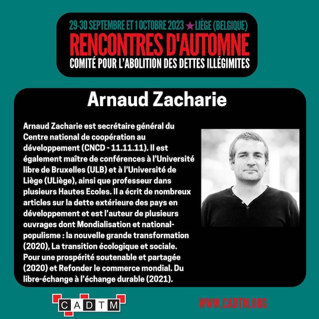 Arnaud Zacharie est secrétaire général du CNCD, et maître de conférence à l’Université libre de Bruxelles et à l’Université de Liège. Il est auteur de plusieurs ouvrages dont « Refonder le commerce mondial. Du libre-échange à l’échelle durable. »