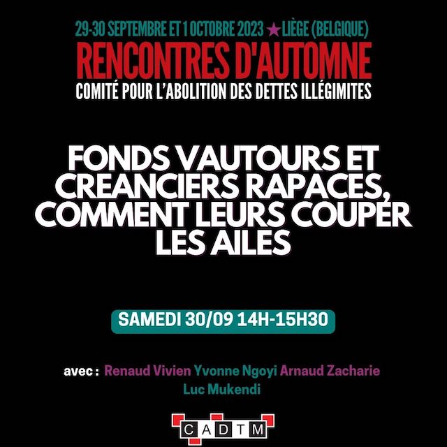 Les rencontres d’automne du CADTM, c’est dans deux semaines ! Elles auront lieu du vendredi 29 septembre au dimanche 1er octobre à l’Auberge Simenon de Liège. Au fil de ces rencontres, aura lieu un atelier sur les fonds vautour : « Fonds vautours et créanciers rapaces, comment leur couper les ailes », le samedi 30 septembre, de 14h à 15h30. Renaud Vivien, Yvonne Ngogi et Arnaud Zacharie font partie des intervenantes. Voici une brève présentation de ces dernieres et de l’atelier ci-dessous.