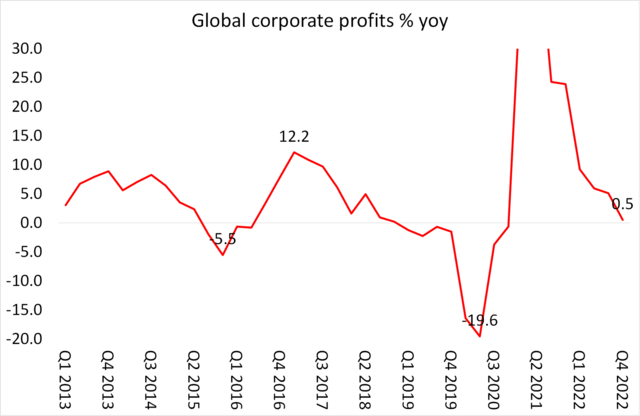The slowdown in US corporate profits is replicated in all the major economies. Here is my latest estimate of global corporate profits based on five key economies. The pandemic slump recorded a 20% fall in global corporate profits in 2020, followed by a 50% recovery in 2021, but now profits growth has slowed to just 0.5% in Q4 2022. And note, as I have done before, that profits had stopped rising through 2019 even before the pandemic, suggesting that the major economies were heading for a slump before COVID emerged.
